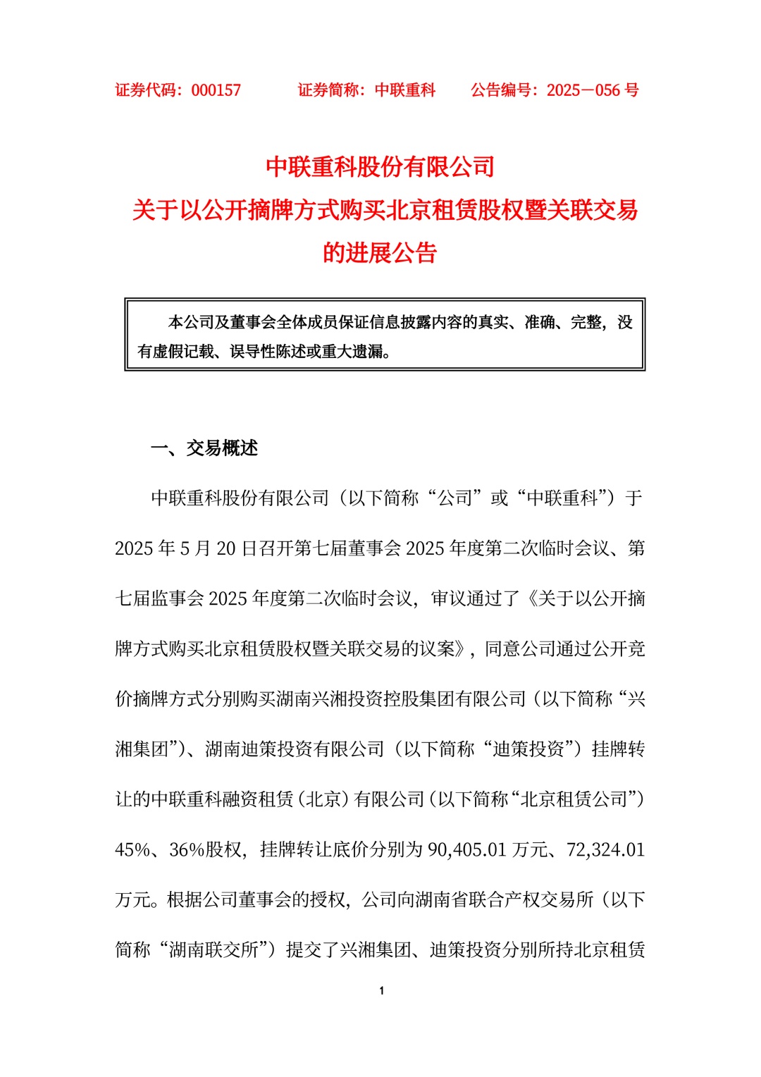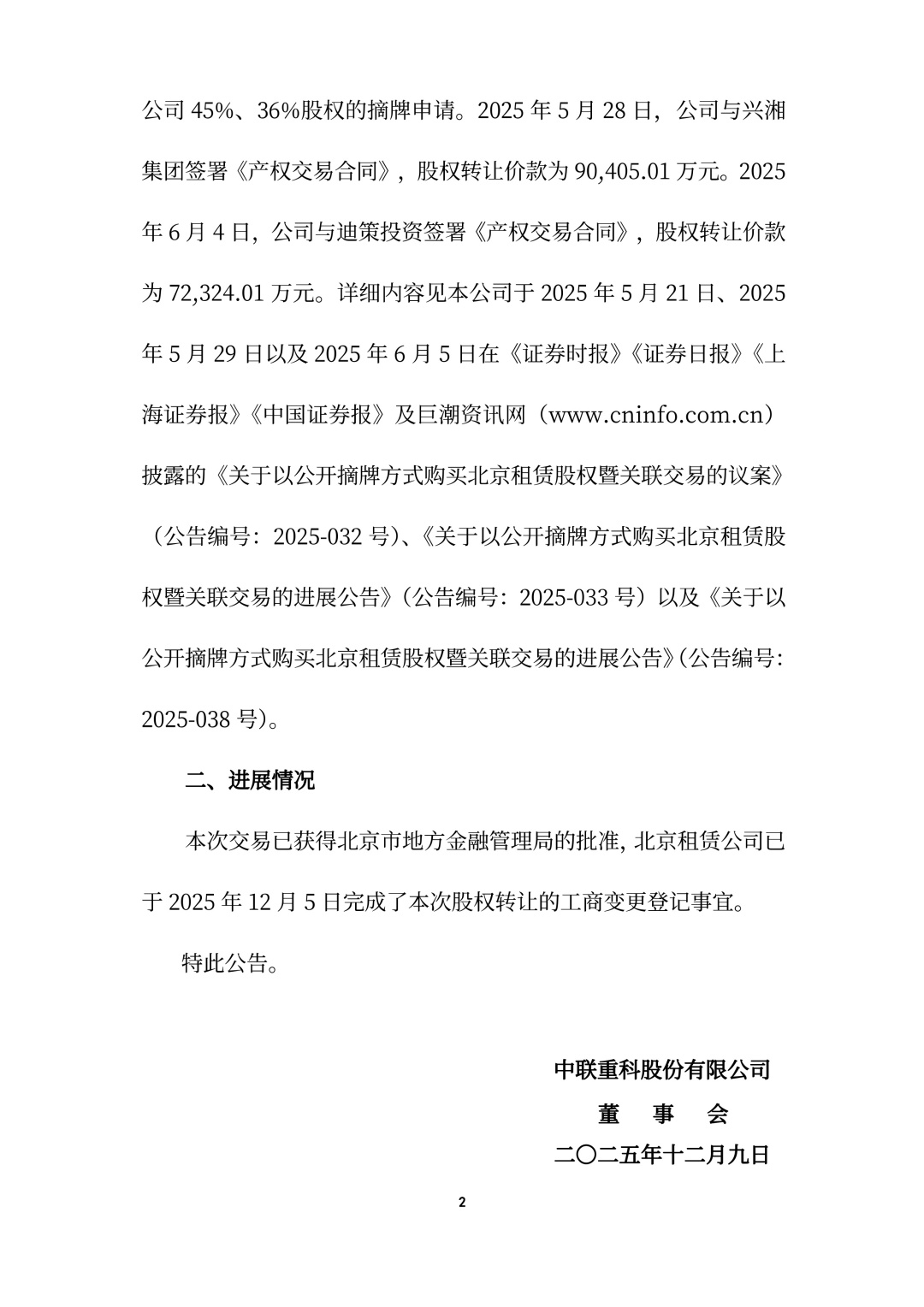 中聯(lián)重科股份有限公司(以下簡(jiǎn)稱(chēng)“公司”或“中聯(lián)重科”)于2025 年 5 月 20 日召開(kāi)第七屆董事會(huì) 2025 年度第二次臨時(shí)會(huì)議、第七屆監(jiān)事會(huì) 2025 年度第二次臨時(shí)會(huì)議,審議通過(guò)了《關(guān)于以公開(kāi)摘牌方式購(gòu)買(mǎi)北京租賃股權(quán)暨關(guān)聯(lián)交易的議案》,同意公司通過(guò)公開(kāi)競(jìng)價(jià)摘牌方式分別購(gòu)買(mǎi)湖南興湘投資控股集團(tuán)有限公司(以下簡(jiǎn)稱(chēng)“興湘集團(tuán)”)、湖南迪策投資有限公司(以下簡(jiǎn)稱(chēng)“迪策投資”)掛牌轉(zhuǎn)讓的中聯(lián)重科融資租賃(北京)有限公司(以下簡(jiǎn)稱(chēng)“北京租賃公司”)45%、36%股權(quán),掛牌轉(zhuǎn)讓底價(jià)分別為 90405.01 萬(wàn)元、72324.01萬(wàn)元。根據(jù)公司董事會(huì)的授權(quán),公司向湖南省聯(lián)合產(chǎn)權(quán)交易所(以下簡(jiǎn)稱(chēng)“湖南聯(lián)交所”)提交了興湘集團(tuán)、迪策投資分別所持北京租賃公司 45%、36%股權(quán)的摘牌申請(qǐng)。2025 年 5 月 28 日,公司與興湘集團(tuán)簽署《產(chǎn)權(quán)交易合同》,股權(quán)轉(zhuǎn)讓價(jià)款為 90405.01 萬(wàn)元。2025年 6 月 4 日,公司與迪策投資簽署《產(chǎn)權(quán)交易合同》,股權(quán)轉(zhuǎn)讓價(jià)款為 72324.01 萬(wàn)元。